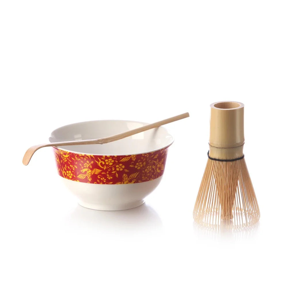 Zestaw zawiera mieszadło, łyżkę i miseczkę z niebieskimi wzorami. Mieszadło i łyżka wykonane są z bambusa.