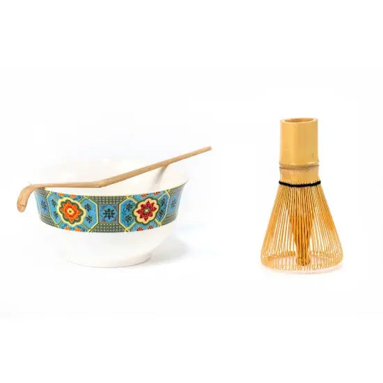 Zestaw zawiera mieszadło, łyżkę i miseczkę z niebieskimi wzorami. Mieszadło i łyżka wykonane są z bambusa.