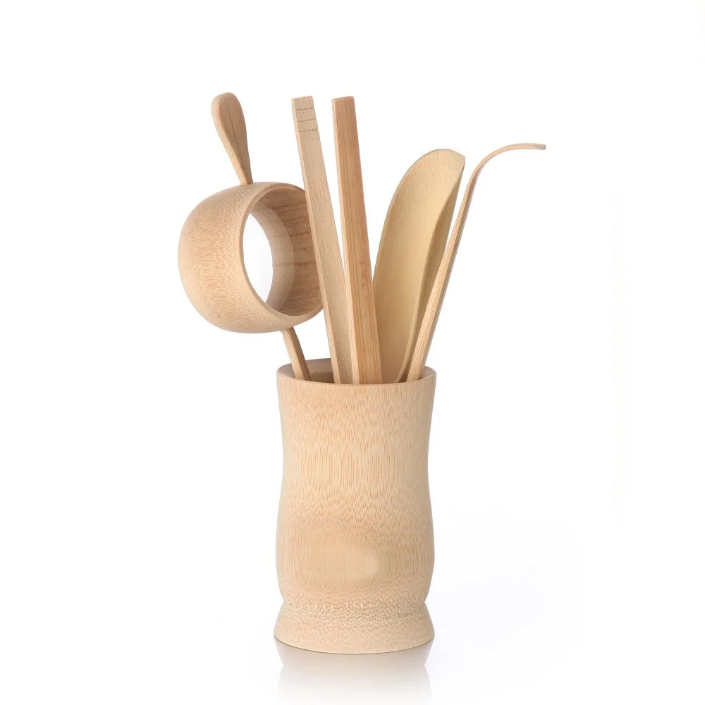 Wykonane z bambusa. Zawiera szufelkę, szczypce, łyżkę i durszlak.
